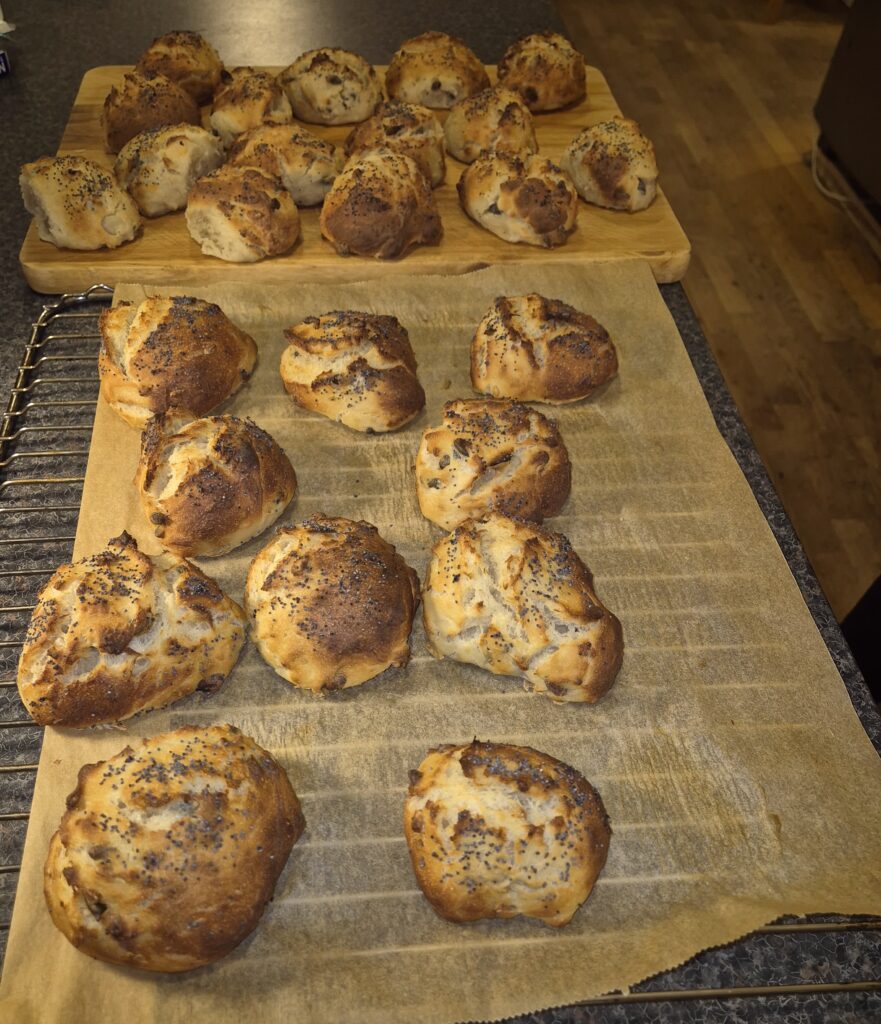 Når pladen er varm indsættes bollerne og bages i 14-16 minutter.